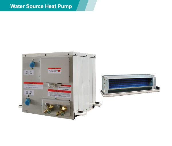 整体式/分离式水源(地下水工况,水环工况,地下环路工况)热泵机组以电作为动力,采用系统循环水,从水井、湖泊、河流、海洋中抽取的水或埋于地下盘管中循环流动的水为冷(热)源,经室内循环空气与室内机热交换器能量转移后,送入所需空调房间。