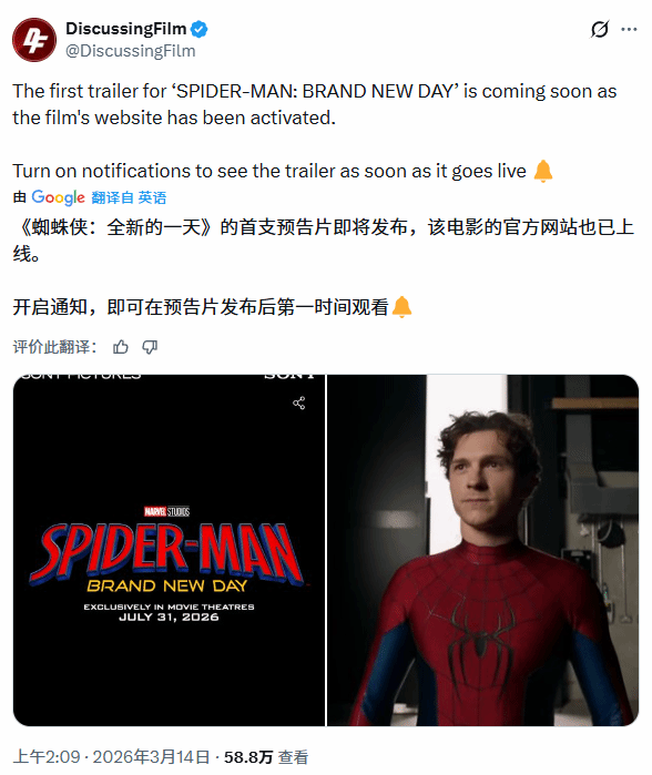 据海外影视媒体 DiscussingFilm 爆料,漫威影业新作《蜘蛛侠:崭新之日》(SPIDER-MAN: BRAND NEW DAY)的官方网站已正式激活,这一信号预示着影片首支预告片即将上线,该媒体也呼吁粉丝开启通知,以便第一时间获取预告发布动态。