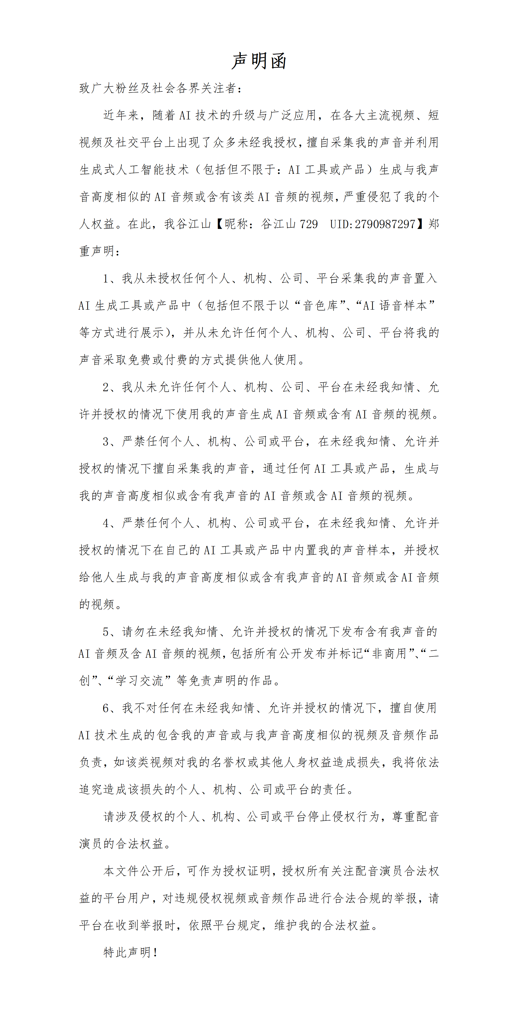 首先,它明确将当前最突出、最迫切的侵权形式(如AI声音克隆、合成)纳入禁止范围,避免侵权方以“声明未明确提及”为由进行抗辩。